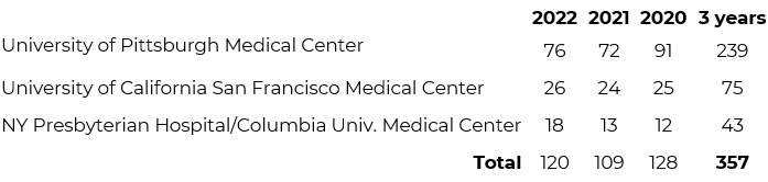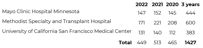 Данные Сети закупок и трансплантации органов (OPTN), представленные в таблицах ниже, показывают, что общее количество трансплантаций печени от живых доноров, проведённых в тройке крупнейших клиник США — 357 на 2020-2022 годы. Тем временем, только наш трансплантационный центр за тот же период провел 500 трансплантаций печени. Это число указывает на высокий операционный потенциал и опыт нашей клиники в области трансплантации печени по сравнению с любым центром в США.